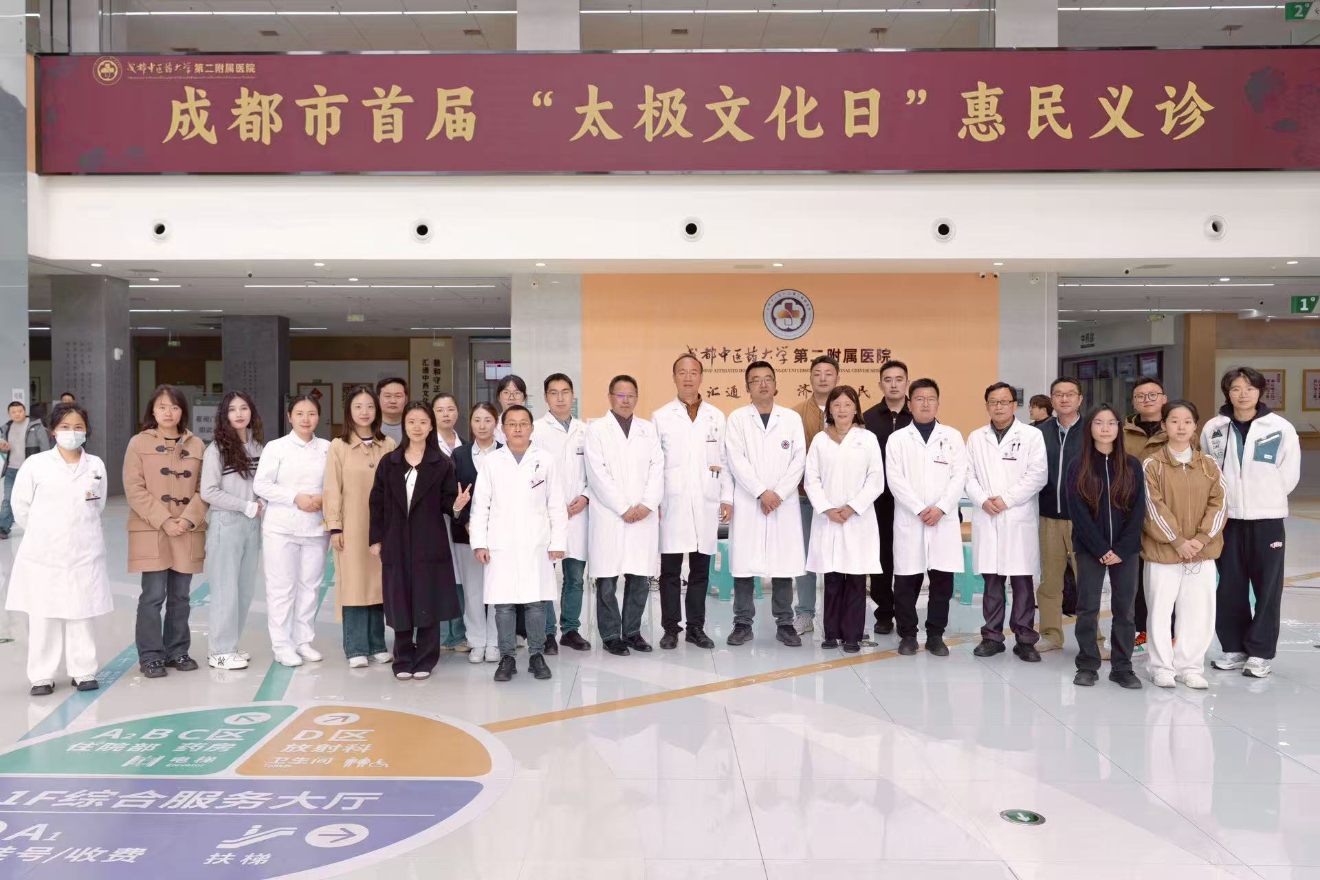 为深入贯彻落实“健康中国”战略和全民健身国家战略,弘扬中华优秀传统文化,推动中医药文化与全民健身深度融合,3 月 21 日,由成都市卫生健康委员会、成都市体育局、成都中医药大学共同主办,成都市武术运动协会、成都中医药学会、成都中医药大学校友总会、成都中医药大学导引医学工作室、成都中医药大学第二附属医院、四川省中医药适宜技术研究会共同承办的成都市首届 “太极文化日” 惠民义诊活动,在成都中医药大学第二附属医院门诊大厅名医义诊专区圆满举办。